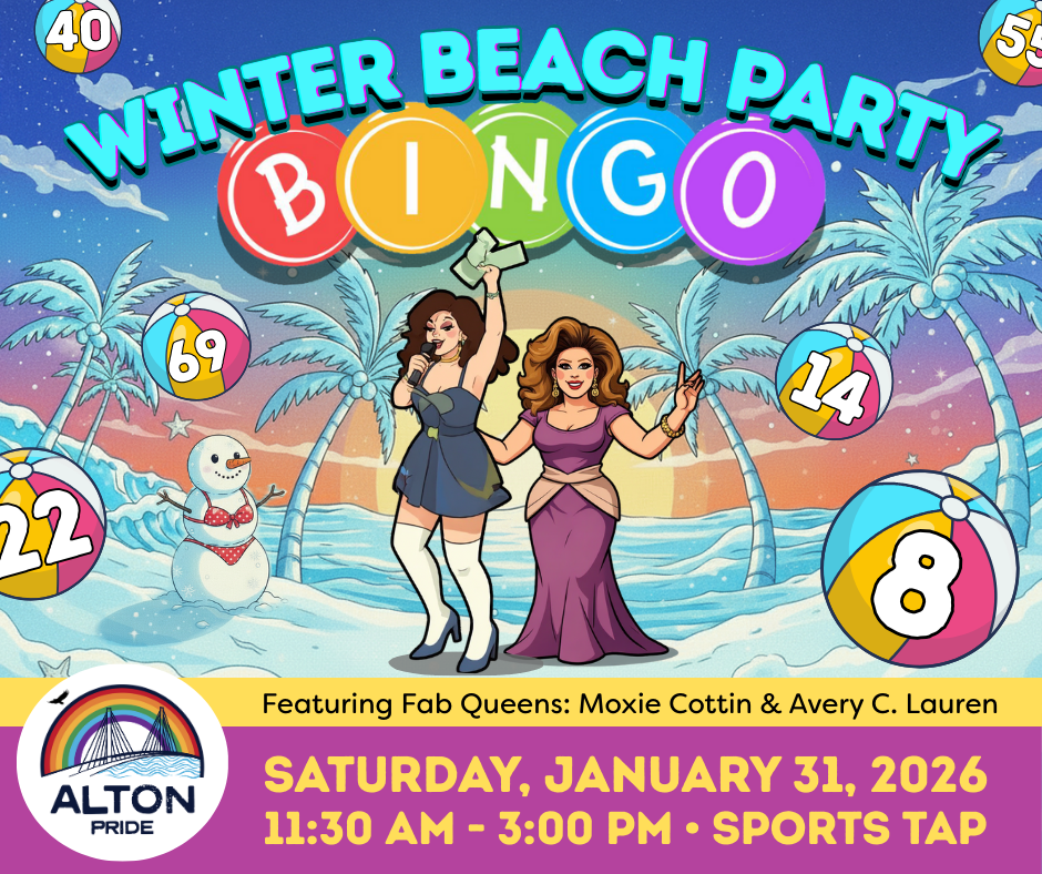 Alton Pride will host a Winter Beach Party Bingo on Saturday, January 31st, from 11:30am - 3:00pm at Alton Sports Tap. Don't wait, this was a sold-out event last year! Games start at Noon with our Fabulous Drag Hosts, Moxie Cotin and Avery C. Lauren. Don't miss your chance for great prizes, wonderful entertainment, and a 50/50 raffle! Plus a bonus game of Heads or Tails for those brave enough to play! Bring your dollar, dollar bills, y'all! Remaining tickets are limited - get yours RIGHT HERE!