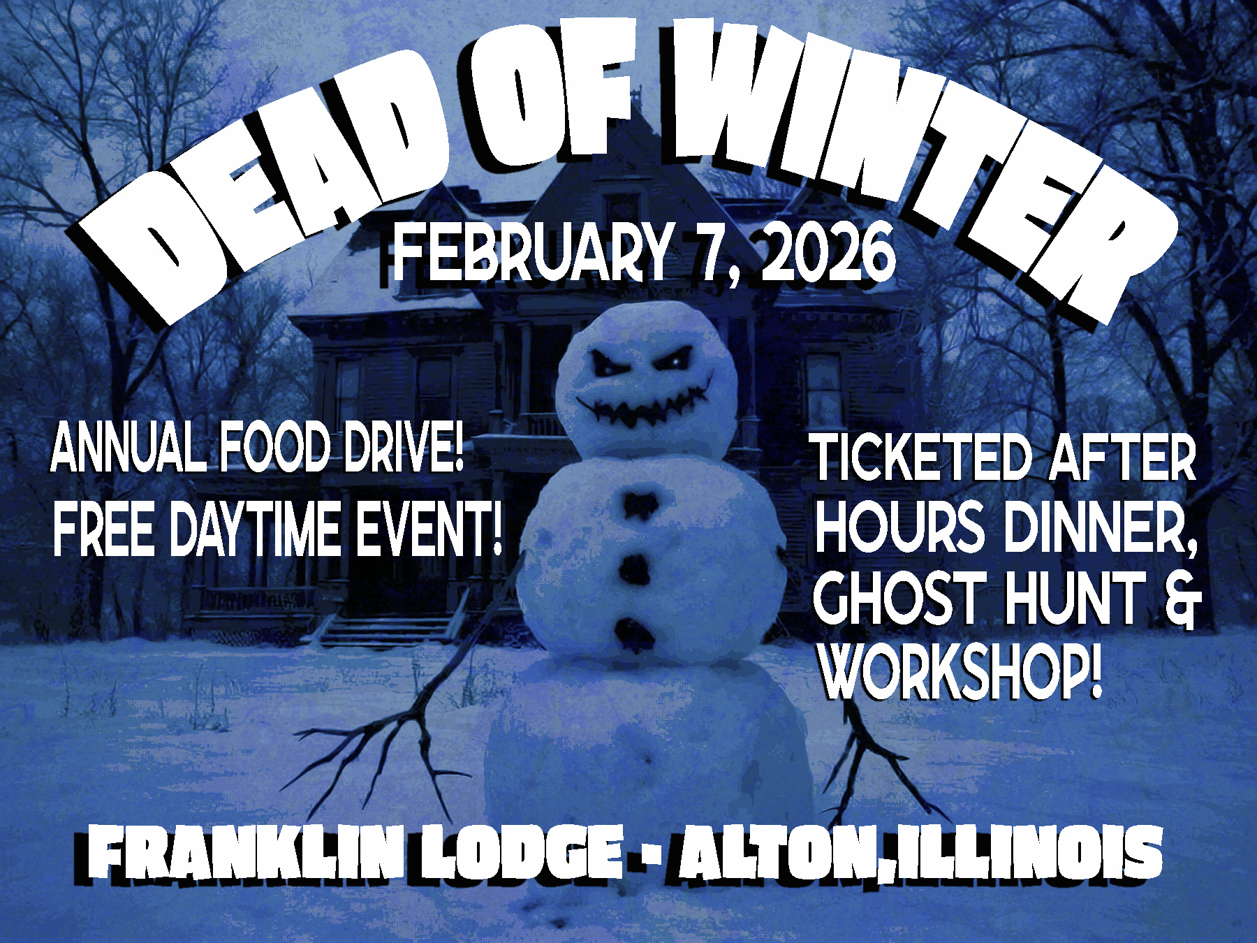 Stop by our NEW location at 301 Piasa Street to check out our expanded collection, new exhibits, and bigger gift shop! Admission is only $7, open Thursday-Sunday from Noon-5pm. We are hosting our 27th annual food drive on February 7th at Franklin Lodge in Alton. We're spending the day celebrating the spooky winter season of ghosts, hauntings, folklore, and legends while also supporting a great cause! This is a FREE event -- but recommended admission is a non-perishable food item for Alton's food banks. We've collected thousands of pounds of food for those in need, and with your help we'd like to make this our biggest year yet! Be chilled by the presentations, meet spooky speakers and authors, browse the vendors, and make this the best day you’ll have all winter! RSVP to our FB event HERE.