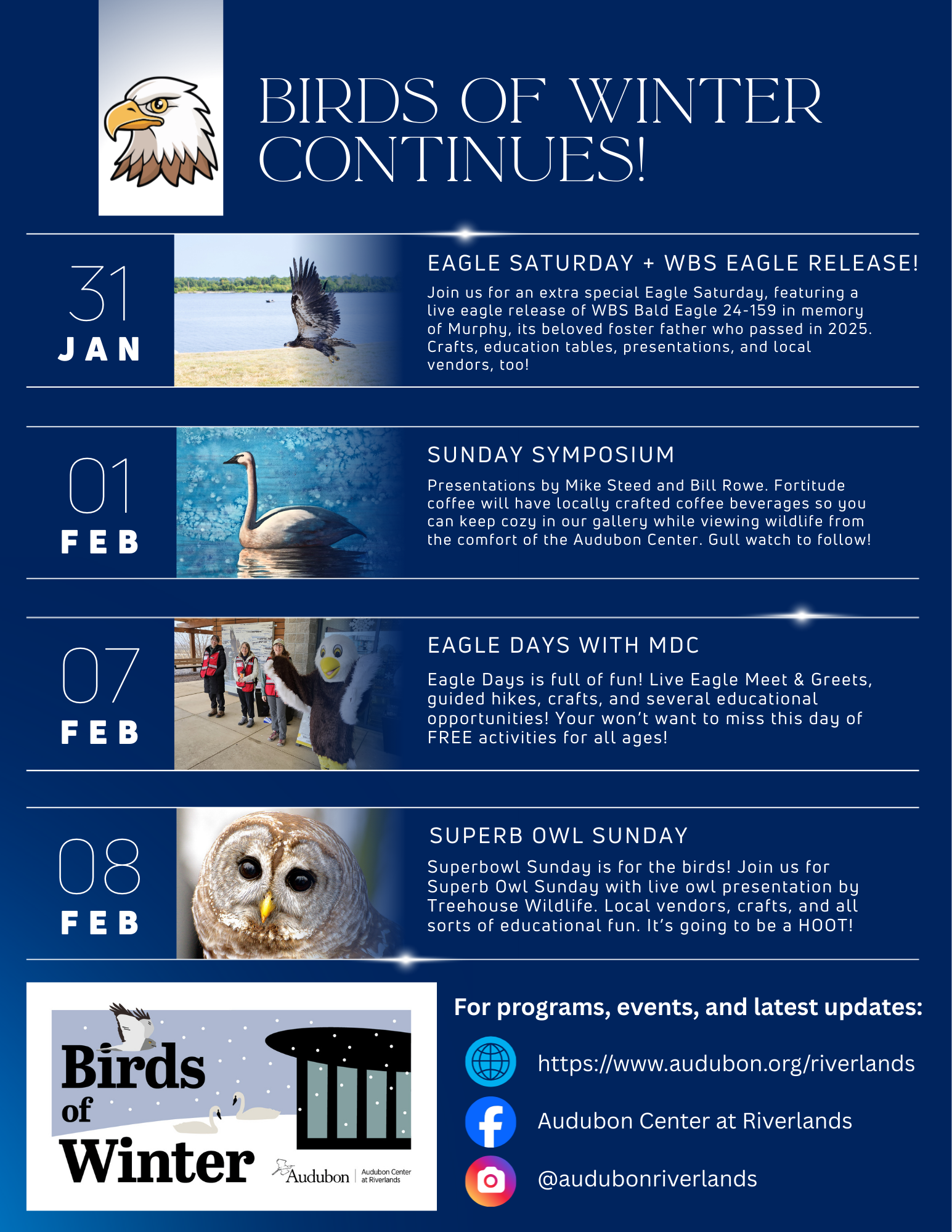 Winter fun is still soaring at the Audubon Center at Riverlands! Join us for two remaining weekends of Birds of Winter. We welcome you to a lineup of events celebrating our feathered friends. This Saturday, January 31st: a special Eagle Saturday featuring a Live Eagle Release. Or stop by for an engaging Sunday Symposium! Next weekend, family-friendly Eagle Days with MDC on February 7th, and a delightfully pun-filled Superb Owl Sunday! There’s something for birders, families, and nature lovers of all ages. Enjoy live presentations, crafts, local vendors, and cozy indoor wildlife viewing. Bundle up, bring your curiosity, and experience winter at Riverlands!