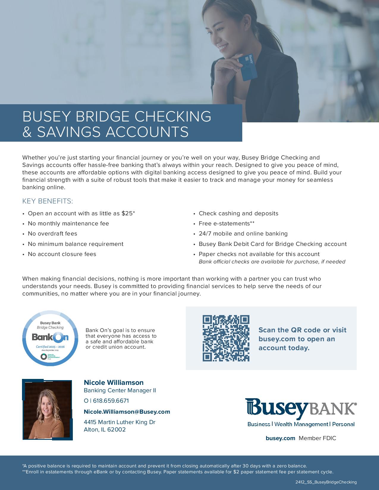 The Busey Bank Bridge Checking & Savings Accounts offer an affordable, hassle-free way to manage your money—whether you’re just starting out or looking for a simpler banking option. With as little as $25 to open an account, no monthly maintenance fees, no overdraft fees, and no minimum balance requirement, Bridge accounts are designed to give you peace of mind. Enjoy 24/7 mobile and online banking, free e-statements, check cashing and deposits, and a Busey Bank debit card. Busey is proud to support financial access for everyone through its Bank On-certified accounts.