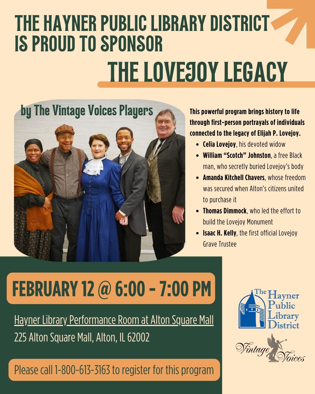 The Vintage Voices Players present: The Lovejoy Legacy on Thursday, February 12th at 6pm at The Hayner Library Performance Room at Alton Square Mall. This powerful program brings history to life through first-person portrayals of individuals connected to the legacy of Elijah P. Lovejoy. To register, please call 1-800-613-3163.