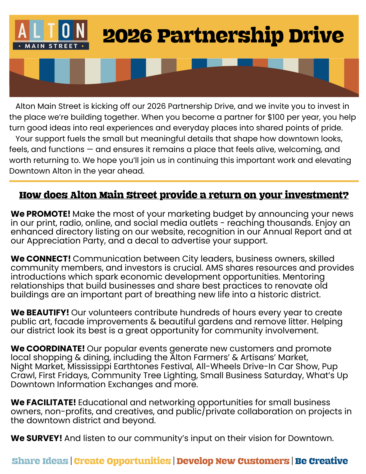 Download our partnership form by clicking the button above! You have the option to send your dues via Paypal by clicking the appropriate button for $100 one-time, $100 recurring annually, or $10 recurring monthly.